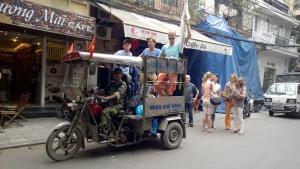 shooting for studiosus in vietnam with perfect transport vehicles – a three wheeler was the best choice for Hanoi´s traffic, and the water buffalo has been booked as  „model“ anyway…